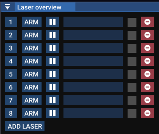 Klicke im Laser Overview Panel auf den roten Button rechts, um einen Laser zu löschen. Füge mit dem ADD LASER Button unten einen Laser hinzu. Siehe auch Laser hinzufügen / entfernen