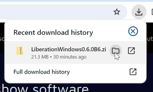 Kliknite Download latest for Windows (brojevi verzija mogu se promijeniti) i vidjet ćete pokazatelj preuzimanja koji prikazuje napredak (obično u gornjem desnom kutu; snimka zaslona je iz Chromea). Kada preuzimanje završi, zadržite pokazivač iznad preuzete datoteke Liberation i kliknite ikonu mape koja se pojavi.