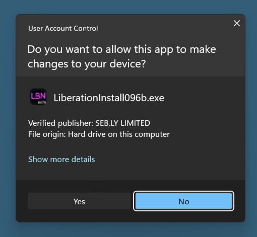Liberation trenger tillatelse til å få tilgang til filer og nettverket, så Windows vil sannsynligvis vise flere forespørselsvinduer. Pass på å godta alt, ellers kan det hende Liberation ikke fungerer som det skal.