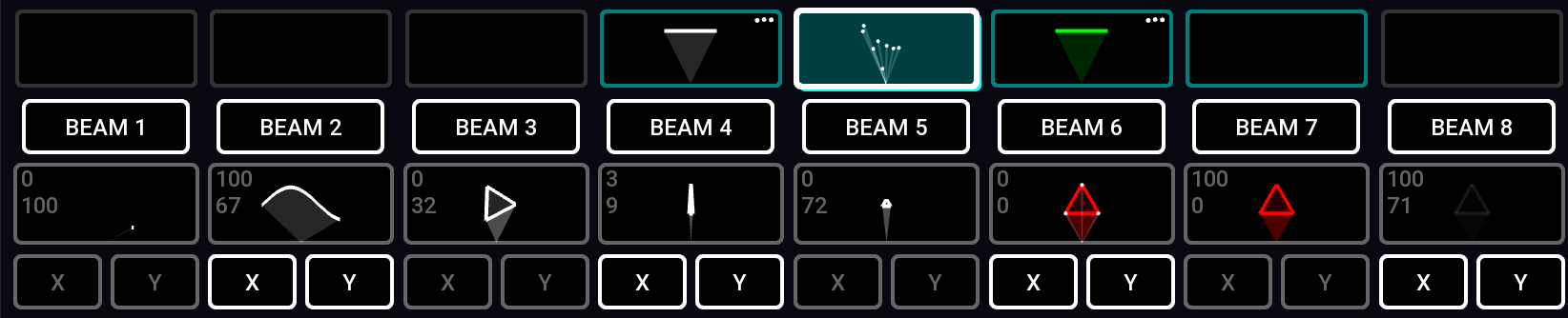 Zmień strefy każdego Clip:\ Uruchom każdy Clip, klikając jego przycisk, a następnie przełącz strefy oraz odbicie X i Y za pomocą przycisków na ekranie. Zobacz Clipy i Clip Deck.