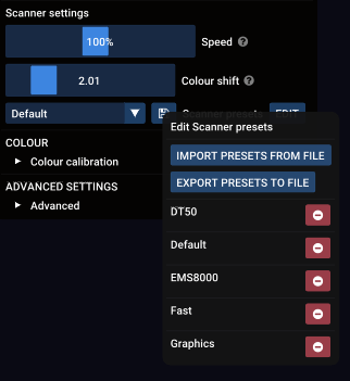 Bir ön ayarı düzenlerseniz, örneğin Default adlı scanner ayarını değiştirirseniz, diğer lazerlerin otomatik olarak güncellenmeyeceğini unutmayın. Bunun yerine, her birinin scanner ayarı artık Default(edited) olarak etiketlenir. Bunu yeni Default ön ayarına güncellemek için açılır listeden yeniden seçin.