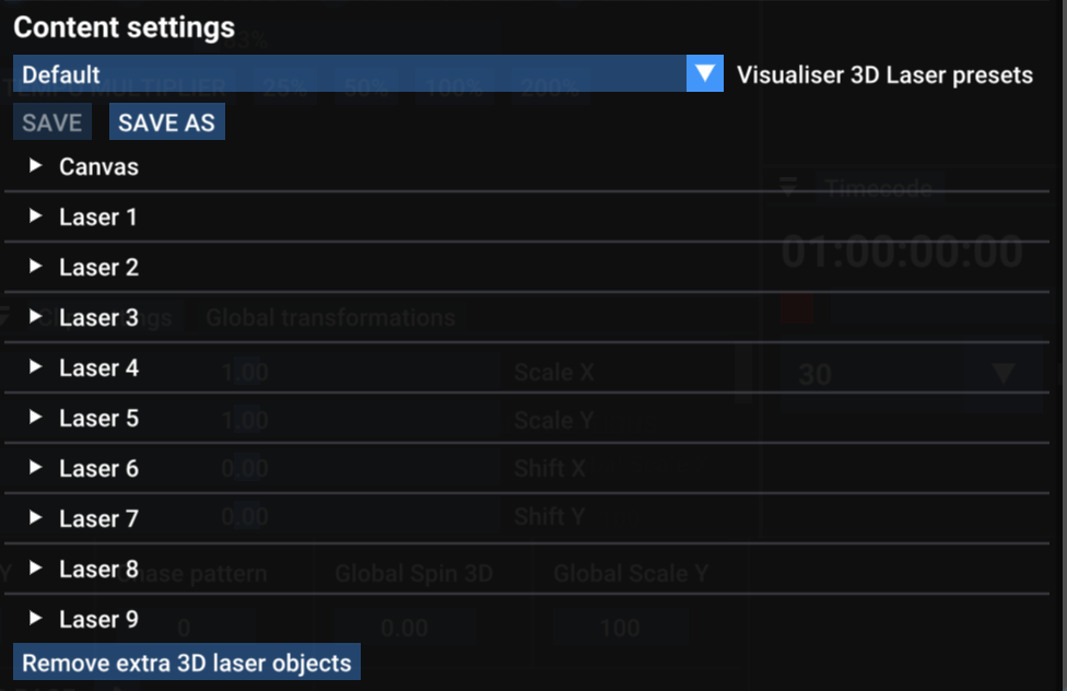 Bu ayarlar, lazerlerin ve Canvas öğesinin 3D ortamda nereye yerleştirileceğini belirler. Bu ayarlar için kaydedip yeniden yükleyebileceğiniz preset’lerin bulunduğu bir açılır menü görebilirsiniz.